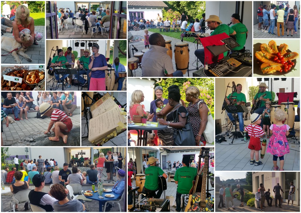 Mit Liedern und zahlreichen Rhythmusinstrumenten unterstützten viele der über 50 anwesenden Asylbewerber aus verschiedensten Ländern und der über 100 sonstigen Gäste die beiden Band-Musiker bei ihren Songs. Für eine zwanglose Atmosphäre, bei der es zahlreiche Kontaktmöglichkeiten gab und für kulinarische Vielfalt sorgte auch das von diversen Gästen mitgebrachte Fingerfood. Über alle Generationen hinweg war bis zum Einbruch der Dunkelheit bei allen beste Laune zu spüren.“ (Text: Karlheinz Rieger)